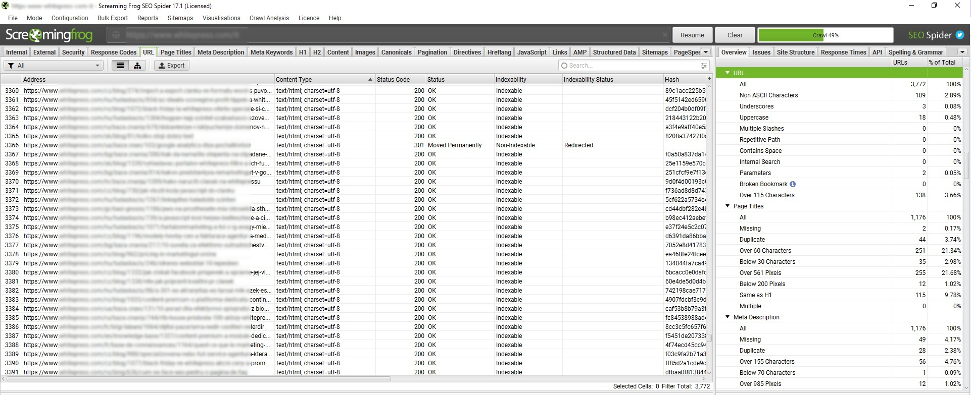 Usa Screaming Frog per raccogliere tutti i dati necessari e avere una panoramica completa dei problemi del sito. Una volta completata la scansione, puoi verificare la presenza di eventuali problemi tecnici, di contenuto e dei backlink del sito.
