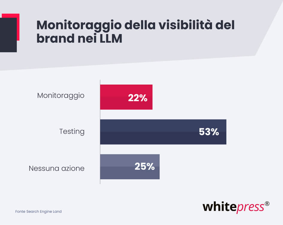 Tuttavia, l'ottimizzazione per l'IA è in una fase iniziale: la maggior parte delle aziende non ha ancora una strategia per la visibilità nelle risposte dell'IA. In un sondaggio presentato a SMX Advanced, solo il 22% dei marketer ha dichiarato di monitorare la visibilità del brand negli LLM (ChatGPT, Gemini, ecc.) o il traffico che generano. Un altro 53% è "in fase di test iniziale"; il resto non sta facendo nulla per ora (Search Engine Land). Questo offre agli early adopter un vantaggio significativo che vale sicuramente la pena sfruttare. Come ha affermato Matt Diggity, un SEO expert di fama mondiale: