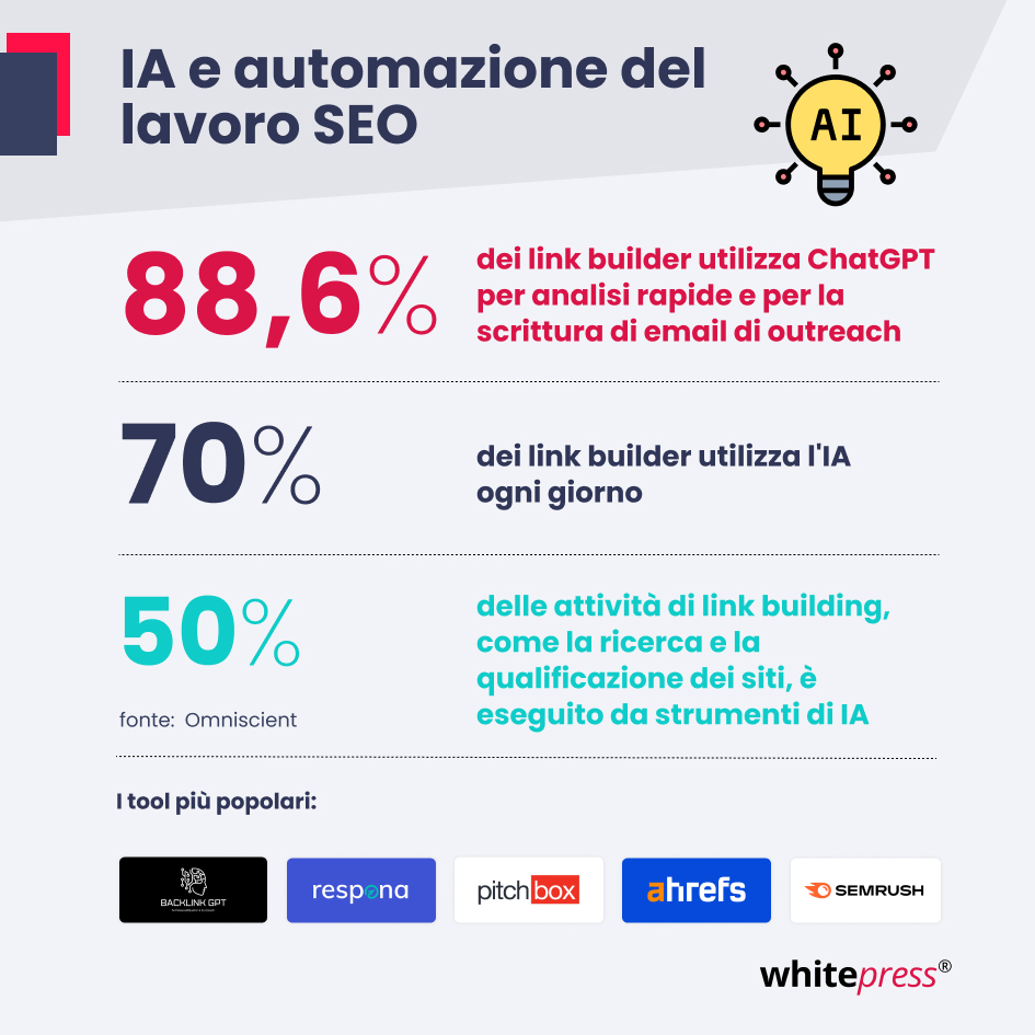 L’IA accelera molti processi monotoni, e la costruzione di un profilo di backlink non fa eccezione. Già oltre il 50% delle attività di link building, come ricerca e qualificazione dei siti, viene eseguito da strumenti di IA. Gli specialisti SEO utilizzano soluzioni come BacklinkGPT, Pitchbox, Respona, Semrush Link Building Tool e Ahrefs Brand Radar. Secondo Omniscient Digital, il 70% dei link builder usa l’IA quotidianamente, e l’88,6% di questi tratta ChatGPT come un “secondo cervello” per analisi rapide e stesura di e-mail di contatto (Omniscient).