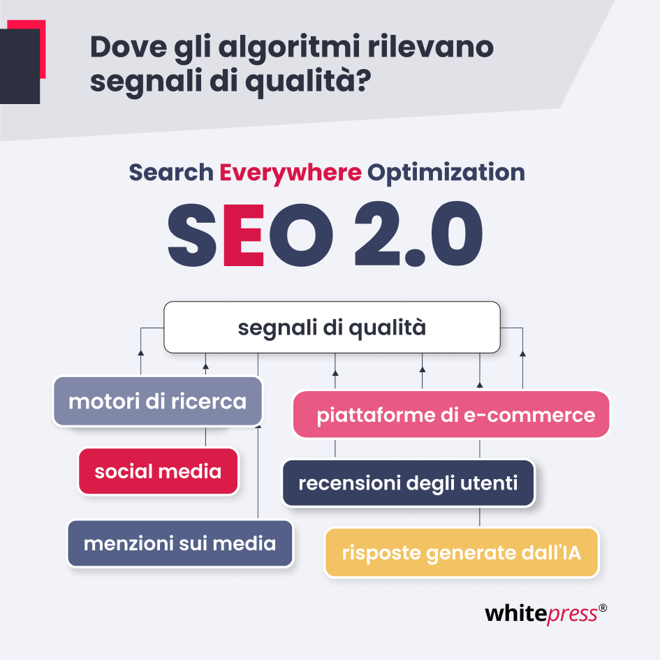 Alla luce di questi cambiamenti, sta emergendo una nuova definizione di SEO: invece di Search Engine Optimization (Ottimizzazione per i Motori di Ricerca), ora parleremmo di Search Everywhere Optimization (Ottimizzazione della Ricerca Ovunque). Nell'era dell'IA, non è più sufficiente ottimizzare solo per Google. La SEO 2.0 significa gestire la visibilità e la fiducia del brand su più canali, incluse le risposte generate dall'IA, le piattaforme social, le menzioni sui media e le recensioni degli utenti. In breve: ovunque gli algoritmi siano in grado di rilevare segnali di qualità e ovunque gli utenti cerchino una conferma per prendere decisioni.