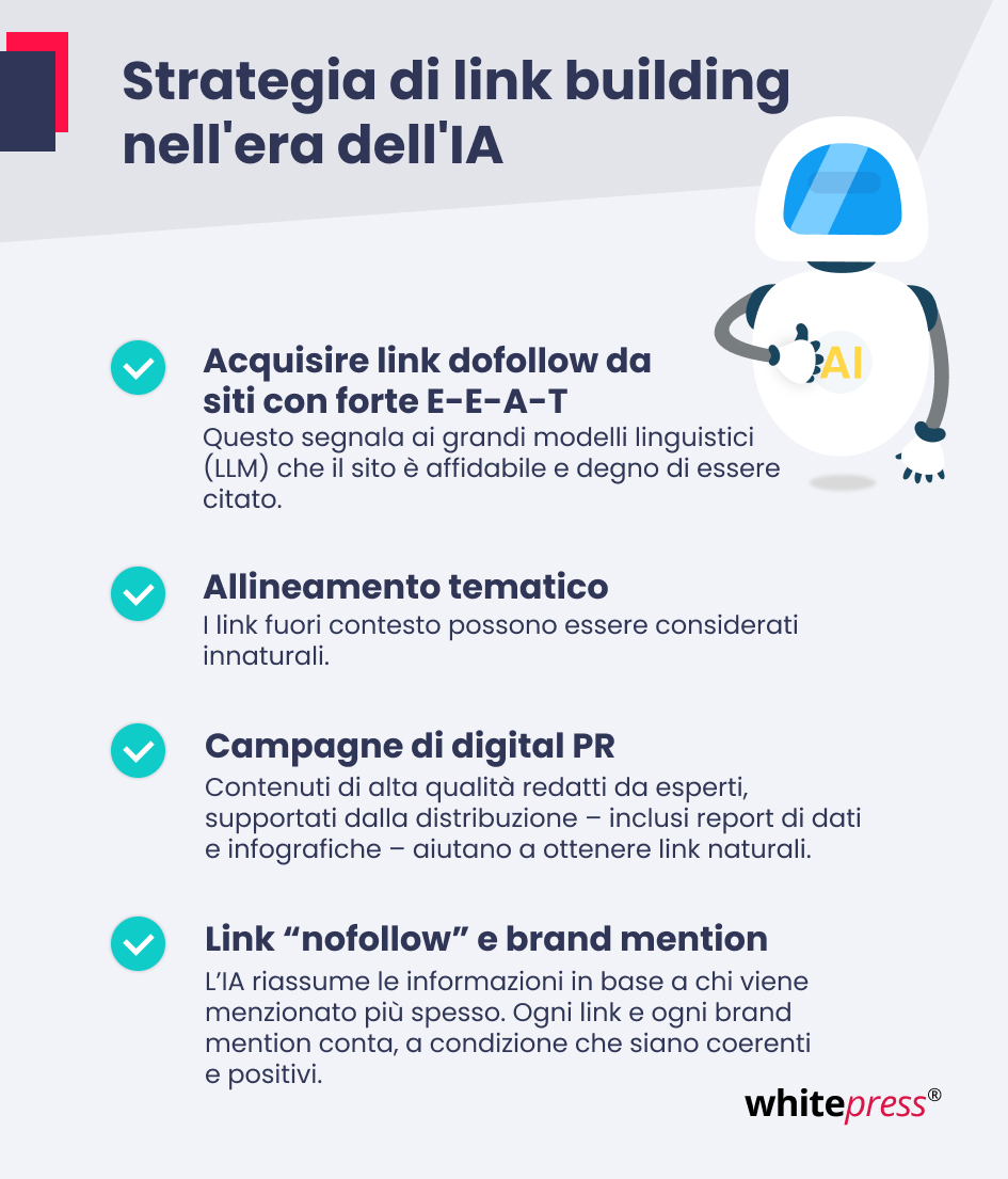 Una strategia di link building efficace dovrebbe concentrarsi sulla sostanza e sulla reputazione delle fonti. Nell'era dell'IA, l'accento deve essere posto sull'acquisizione di link dofollow da siti web con elevati standard E-E-A-T (Esperienza, Competenza, Autorevolezza, Affidabilità) e alta domain authority. Più un sito ha di tali link, più chiaro è il segnale, non solo per Google ma anche per gli LLM, che il sito è credibile e merita di essere citato. Anche l'allineamento tematico è importante: i link al di fuori del contesto pertinente rischiano di essere contrassegnati come innaturali.