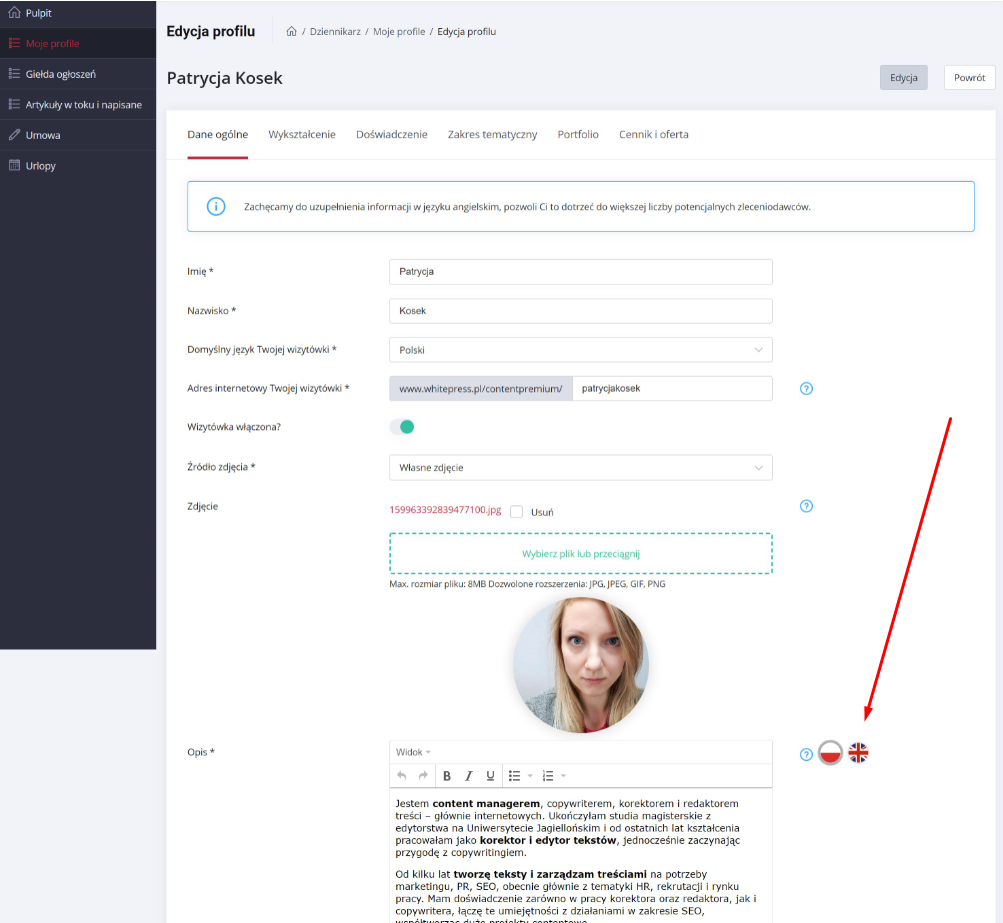 Bardzo przydatną funkcją, z której zalecamy skorzystać przy zakładaniu profilu dziennikarza, jest utworzenie angielskiej wersji językowej wizytówki. Jeżeli dobrze posługujesz się angielskim, zamieszczenie informacji w obu wersjach językowych może znacznie zwiększyć liczbę propozycji zleceń. Pamiętaj, że platforma WhitePress® działa już w ponad 20 językach, a moduł Content Premium stopniowo wdrażany jest na poszczególnych rynkach.