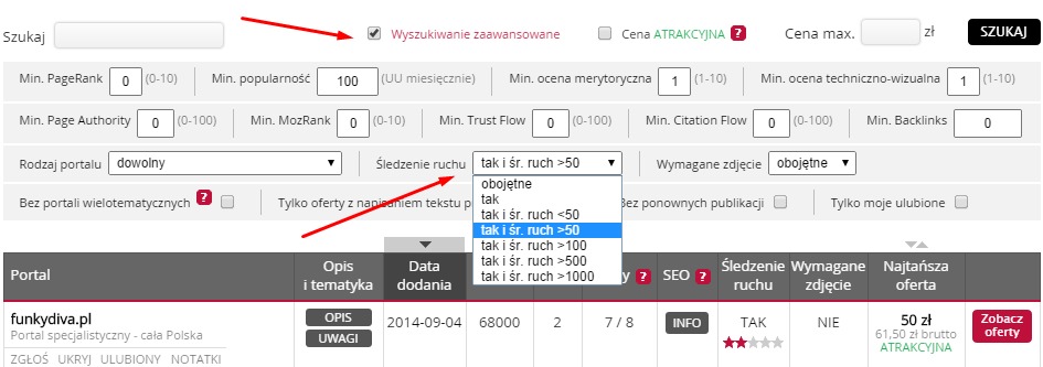 Dodatkowo możemy przefiltrować wszystkie portale ze względu na skuteczność ich publikacji. W tym celu należy wybrać wyszukiwanie zaawansowane i w sekcji "Śledzenie ruchu" wskazać odpowiednia opcję.