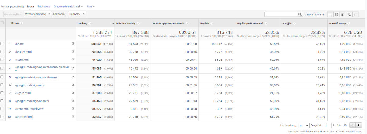- liczbę zdarzeń czy konwersji zrealizowanych na danej stronie.