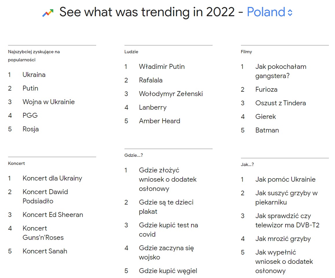 Co roku dzieje się tak wiele wydarzeń, że wiele z nich po prostu nam umyka. Nakreślenie najpopularniejszych wśród internautów obszarów z różnych dziedzin może pomóc nam w przygotowaniu podsumowania roku w naszej branży czy firmie. Trendy wyszukiwania możemy sprawdzić globalnie od 2001, a dla Polski od 2008 roku (z wyjątkiem 2010).