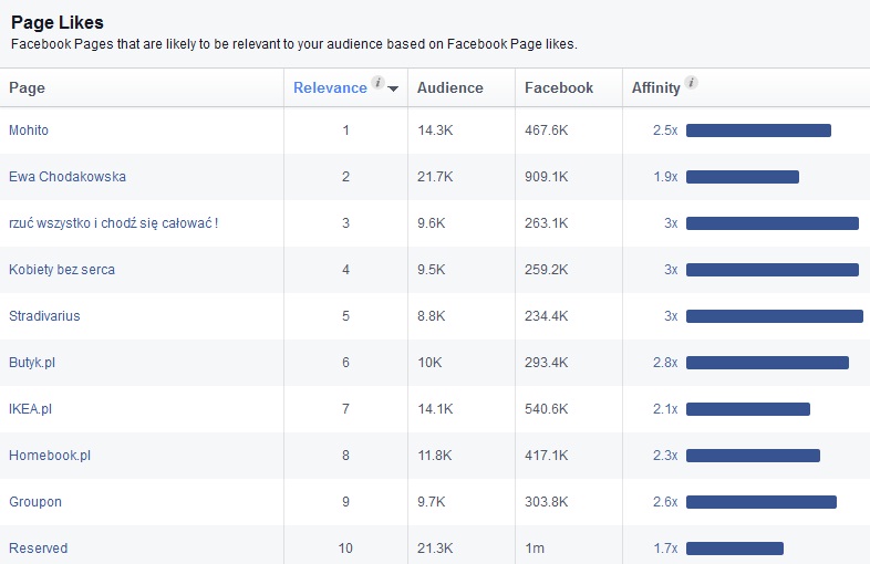 Przypuśćmy, że pracujemy nad ogólnopolską kampanią dotyczącą nowej linii lakierów do paznokci znanej marki, sprzedającej produkty online. Interesuje nas grupa kobiet w wieku 25-34 lata, śledzących nowinki ze świata kosmetyków, a także dbających o formę i często robiących zakupy online. Korzystając z Facebook Ads możemy „prześwietlić” polubienia i aktywność tej grupy na Facebook’u, wybierając obszary poszukiwań najbardziej z nią związane. Można również określić bardziej zaawansowane opcje – zachowanie w sieci, status związku, poziom edukacji etc.