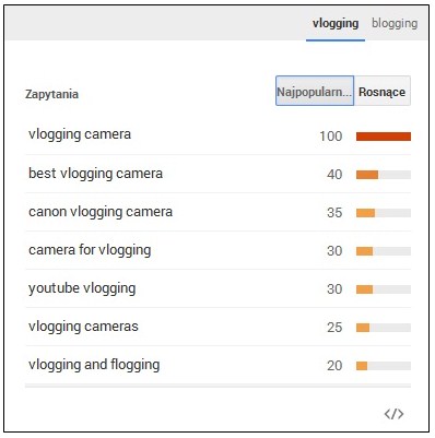 Ciekawa rzecz pojawiła się w polu Podobne Wyszukiwania, a konkretnie w zapytaniach odnośnie „vloggingu” – widzimy, że największym i wciąż rosnącym zainteresowaniem cieszą się zapytania na temat kamer do vloggingu. Jest to konkretna informacja dla producentów i sprzedawców sprzętu wideo.