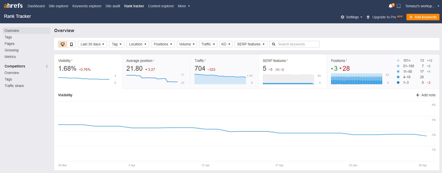 - Poziții (Positions) - un număr de cuvinte-cheie care se află într-o creștere sau scădere (creștere - indicată prin plus, scădere - indicată prin minus).