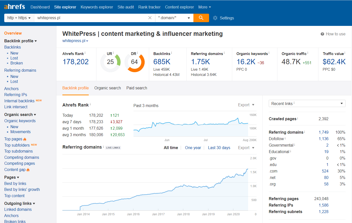 WhitePress® permite generarea de statistici de domeniu. Accesul la Ahrefs nu este necesar pentru a verifica cei mai importanți parametri ai proiectului poziționat. Cei mai importanți parametri includ: