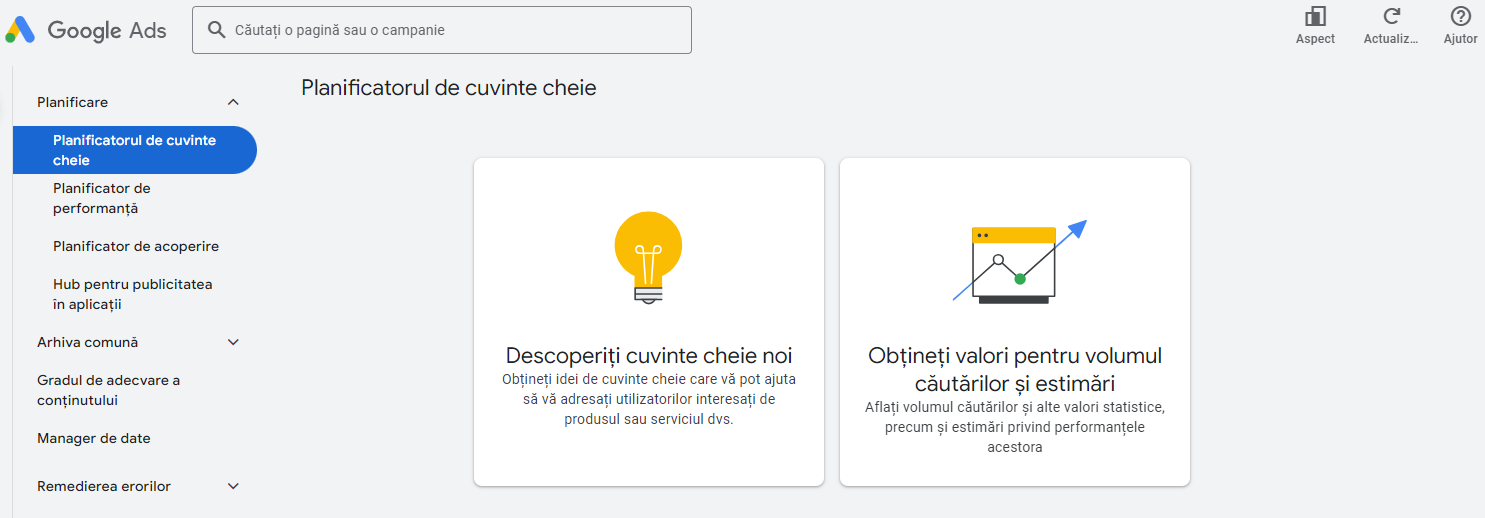 Ai realizat toate aceste activități cu atenție maximă și ai notat fiecare idee, iar apoi ai selectat cele mai relevante, limitându-te la un maxim de 10. Următorul pas este să găsești un instrument care să te ajute să le analizezi. Există multe opțiuni de calitate, precum Ahrefs și Semrush, însă costurile acestora pot fi descurajante. Din fericire Google ne oferă o soluție suficient de utilă, gratuit: Google Keyword Planner: https://